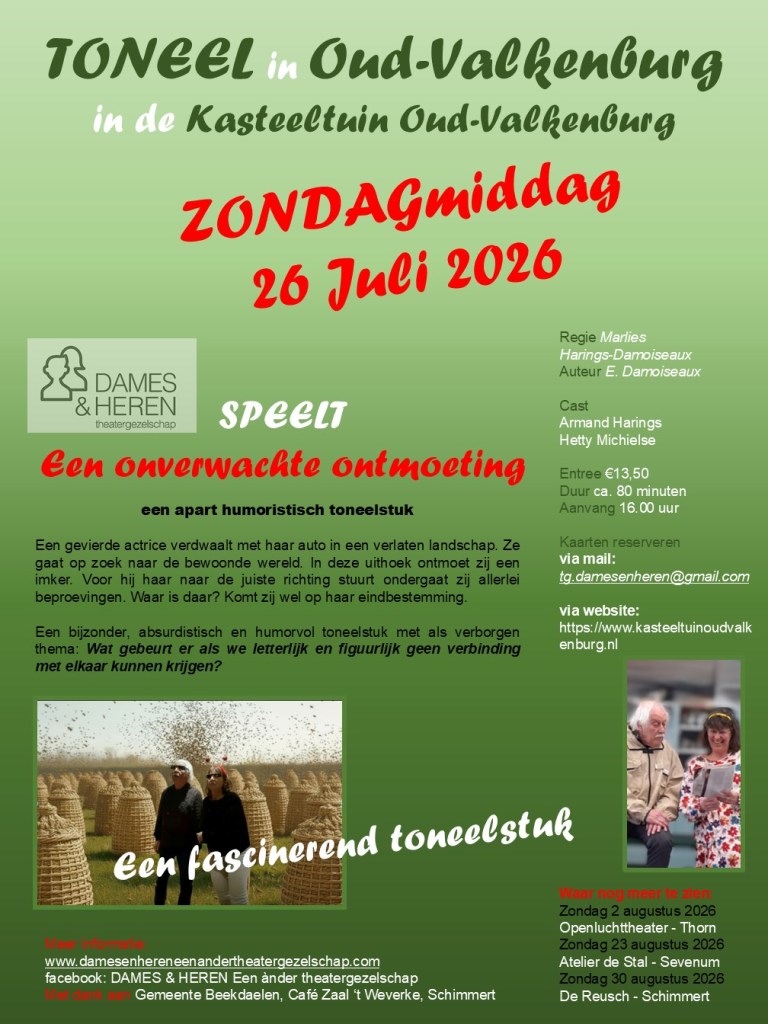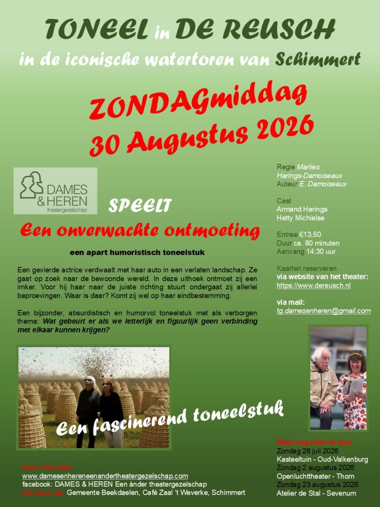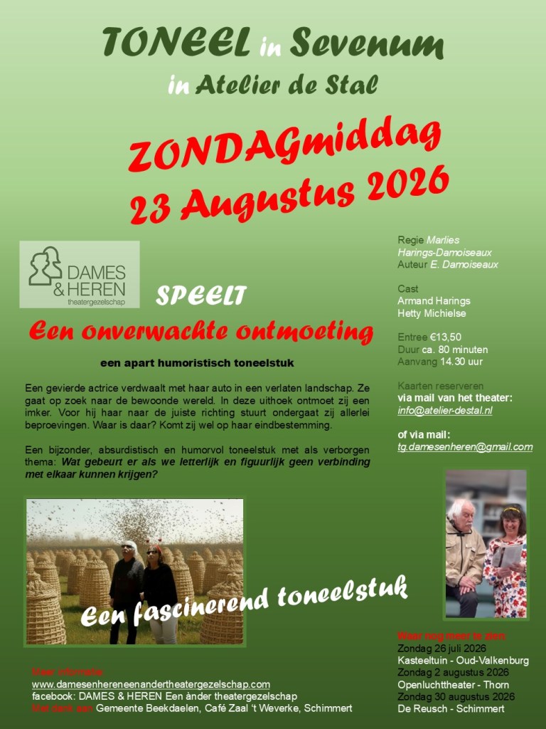 Zondag 23 augustus 2026 in Sevenum > Atelier de Stal aanvang 14.30 uur reserveren via theater. info@atelier-destal.nl